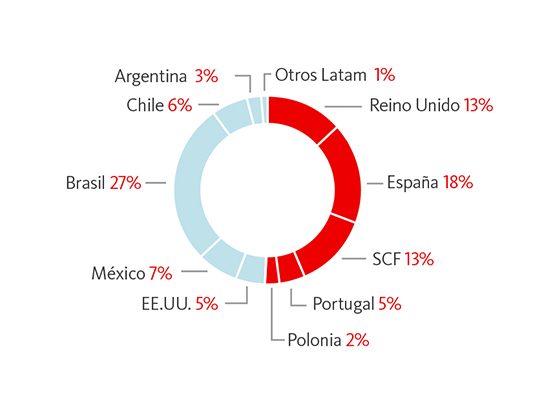 Beneficio de 1.099 millones de euros, con un aumento interanual del 23%, muy apoyado en la buena evolución del margen de intereses y comisiones, reflejo del crecimiento de volúmenes y la mejora de spreads. Destacan los resultados obtenidos por Brasil, con 677 millones (+27%) y México, con 175 millones (+14%).