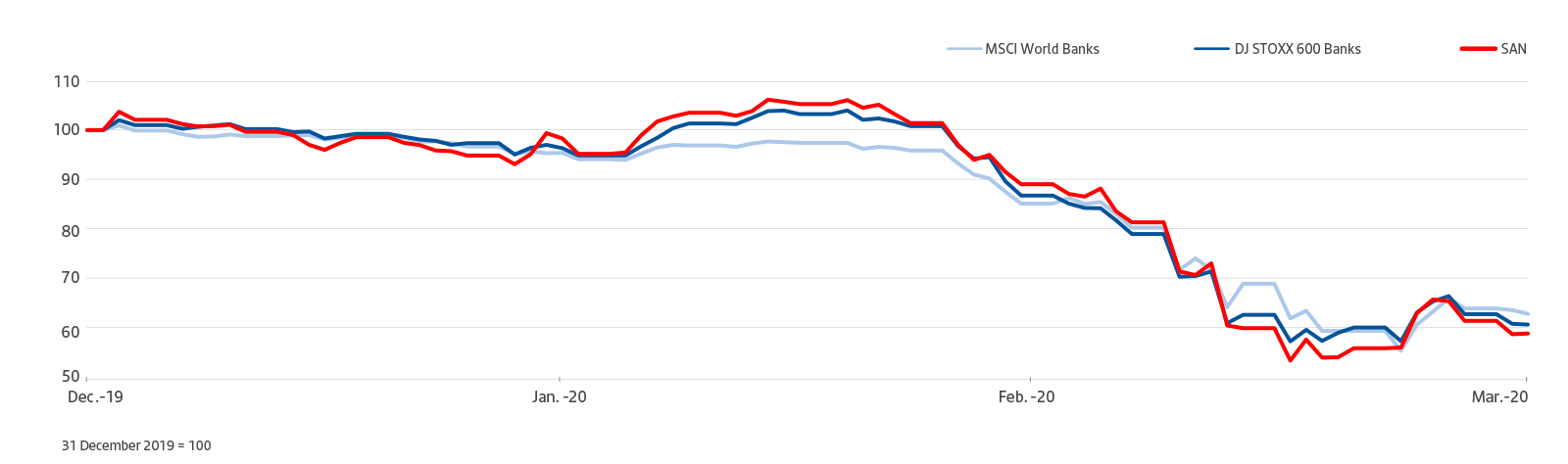 As such, the leading European banking index, DJ Stoxx Bank decreased 38.7% while the MSCI World Banks index declined 36.6%. The Santander share price ended the quarter at EUR 2.218, 40.5% lower.