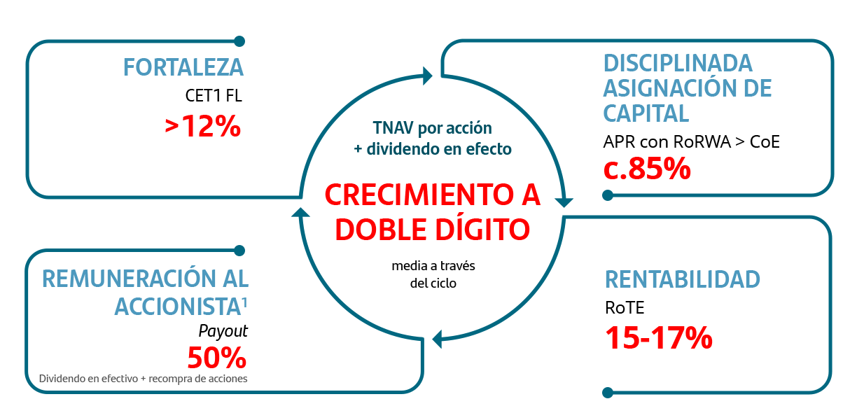 1. El objetivo de remuneración será de aproximadamente el 50% del beneficio neto atribuido (excluyendo impactos sin efecto en caja ni efecto directo en ratios de capital), distribuido en torno al 50% en dividendo en efectivo y el 50% en recompras de acciones. La aplicación de la política de remuneración a los accionistas está sujeta a futuras aprobaciones corporativas y regulatorias.